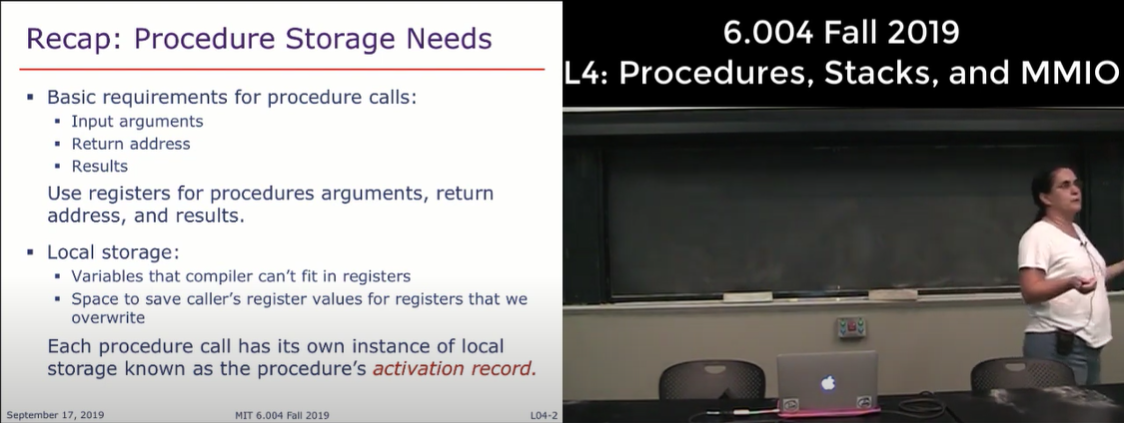要存储输入参数,返回地址和计算结果,仅仅使用寄存器并不能满足这些全部的要求,上节课提到了堆栈。